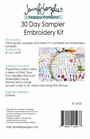 The 30 Day Sampler Embroidery Kit will take one through the everything they need to learn embroidery. Starting with the basics of embroidery on day one. Learn a new embroidery stitch each day building on the previous days knowledge. Complete illustrated stitch guide is included in the kit. Online videos are also included with purchase. Each kit includes a login code to access the 30 plus videos. Some of the stitches include the back stitch, queen stitch, wagon wheels, and woven picot. When the sampler is finished your customer have a sampler completed with all thirty stitches. Stores can teach this kit as a class.
