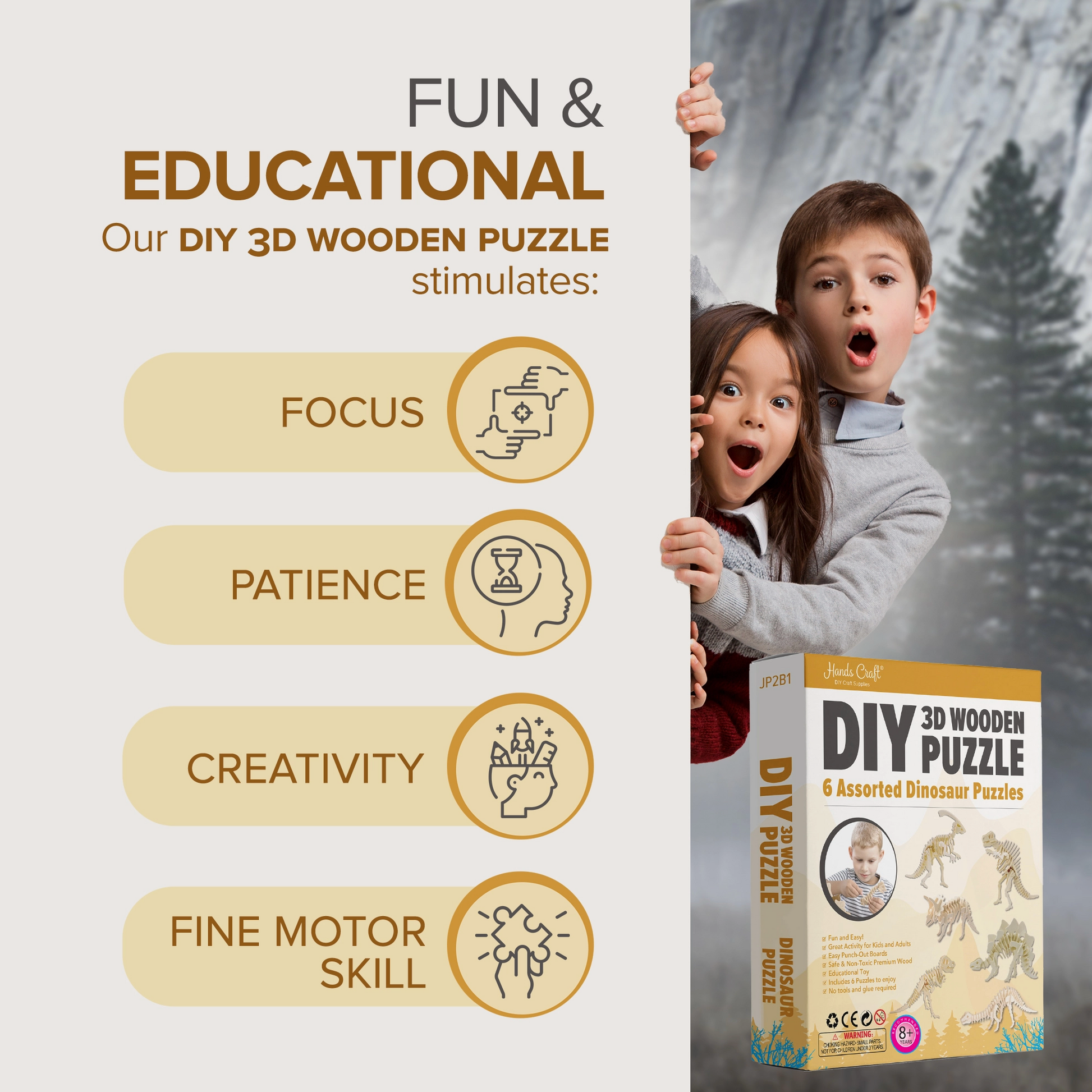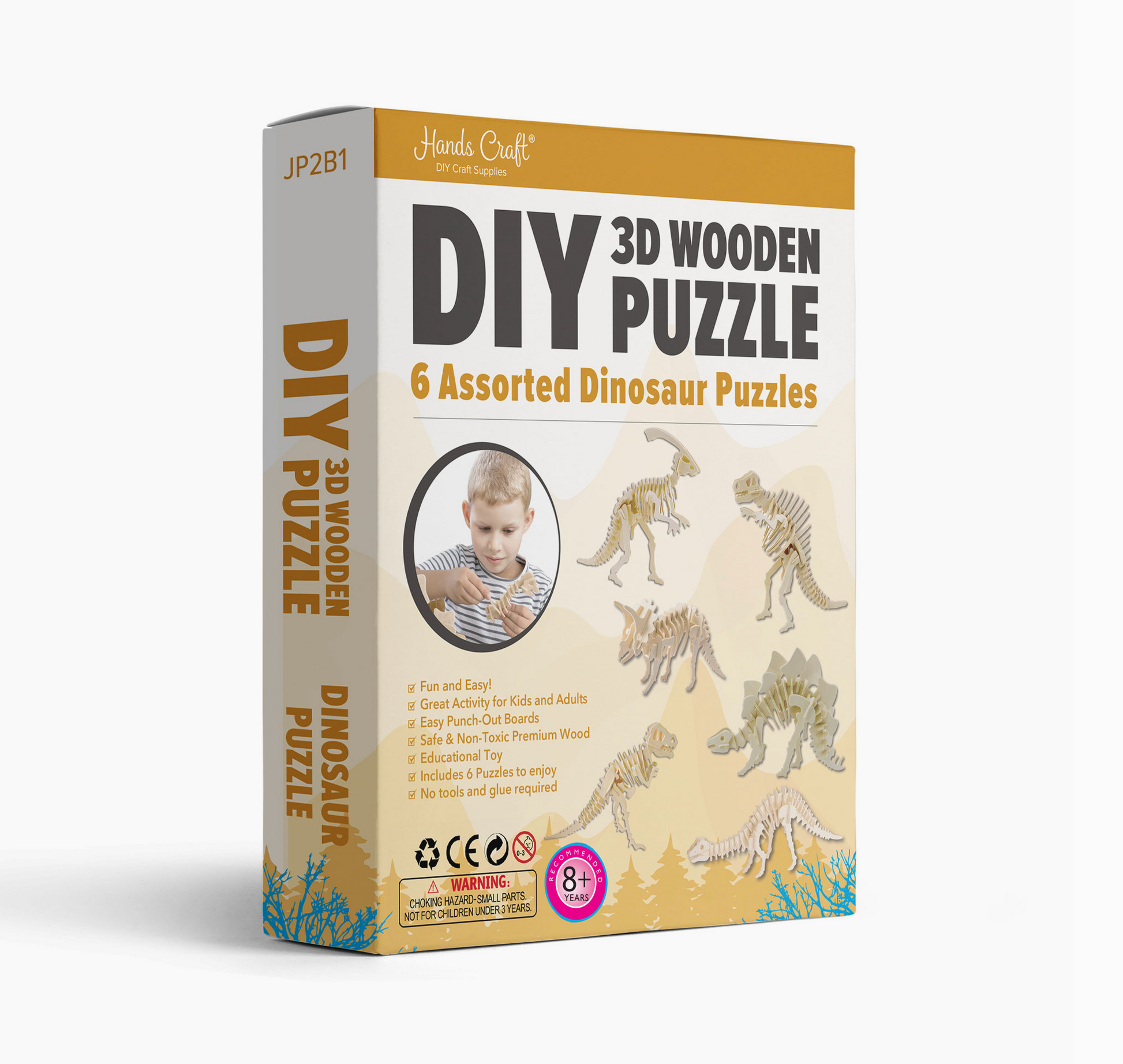6 pc Puzzle Bundle Set: This bundle pack includes: T-Rex, Brontosaurus, Spinosaurus, Triceratops, Stegosaurus, and Parasaurolophus. No tools or glue is required to build your very own dinosaur puzzles!