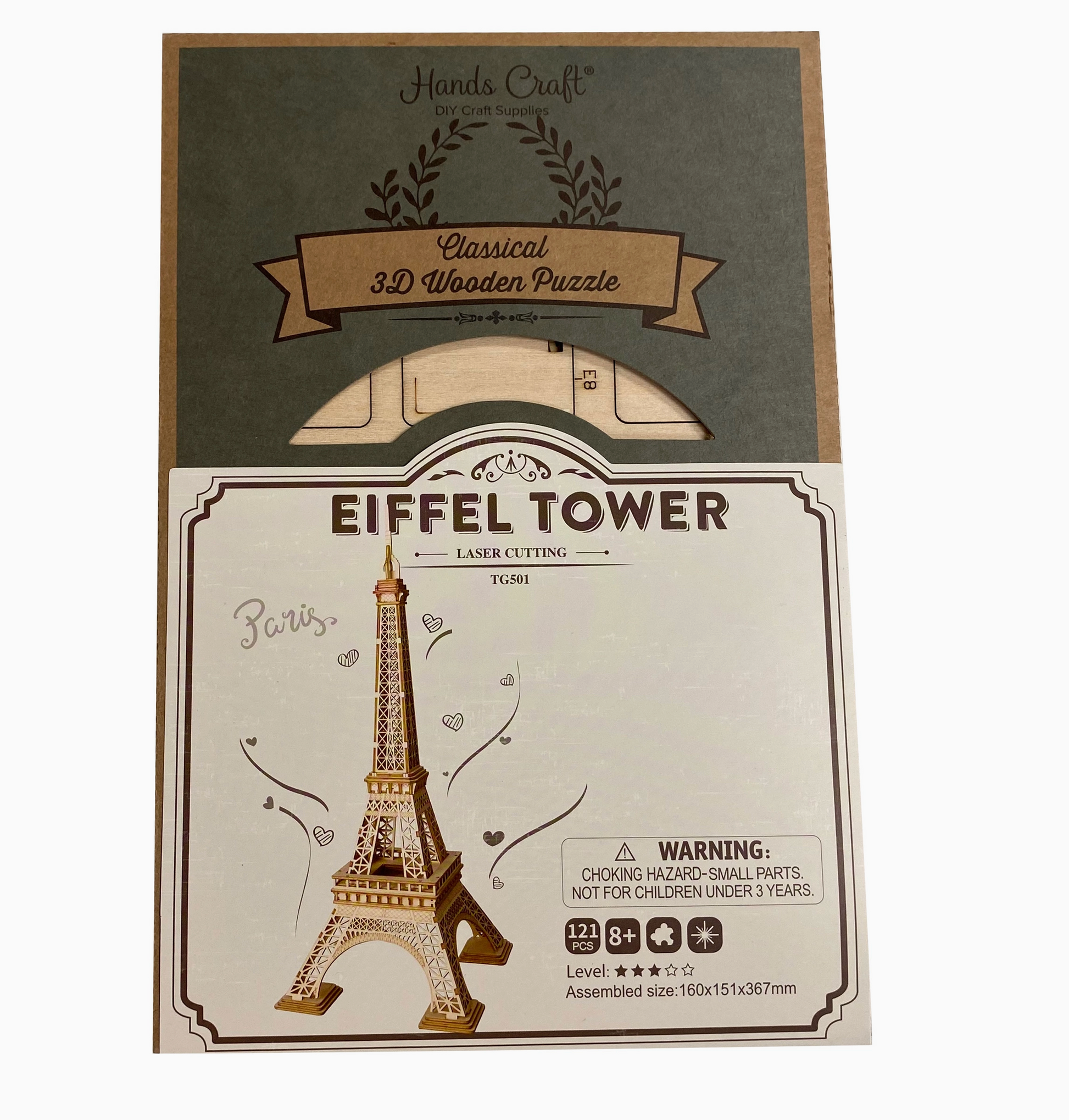 Rolife Eiffel Tower is 3D puzzle made from laser cut wood. Pop out the pieces from the wooden panels to assemble. No glue required. The pieces are all pressed together and fit snugly.