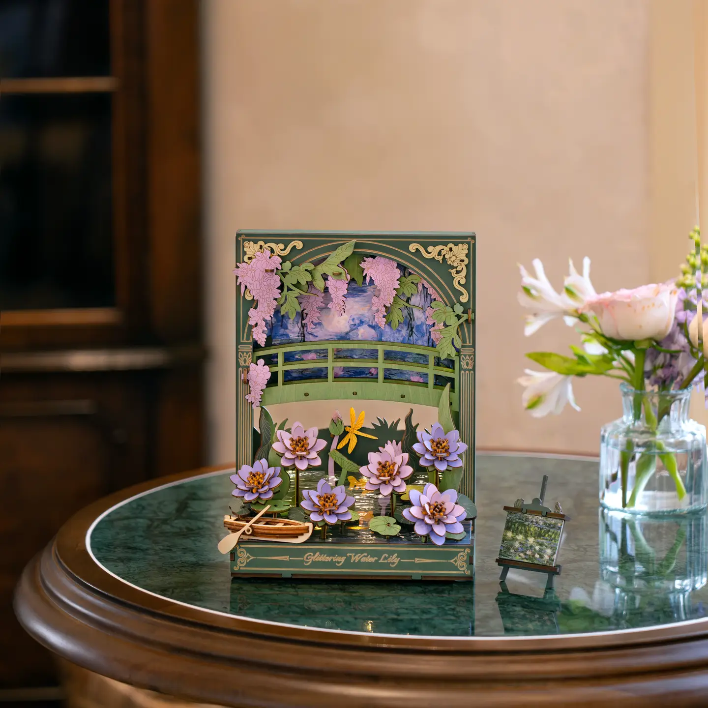 The 3D Wooden Puzzle: Glittering Water Lily Wall Art captures Claude Monet’s fascination with light and reflections in a relaxing, buildable decor piece. Featuring 237 precision-cut wooden pieces, this layered scene includes blooming lilies, a wooden rowboat, and a garden bridge, all brought to life with soft LED ambient lighting. Ideal as a night light, bookshelf accent, or thoughtful gift, this puzzle offers both a creative hands-on experience and a serene, dreamlike display. Batteries (2 × AAA, not included) required for lighting.