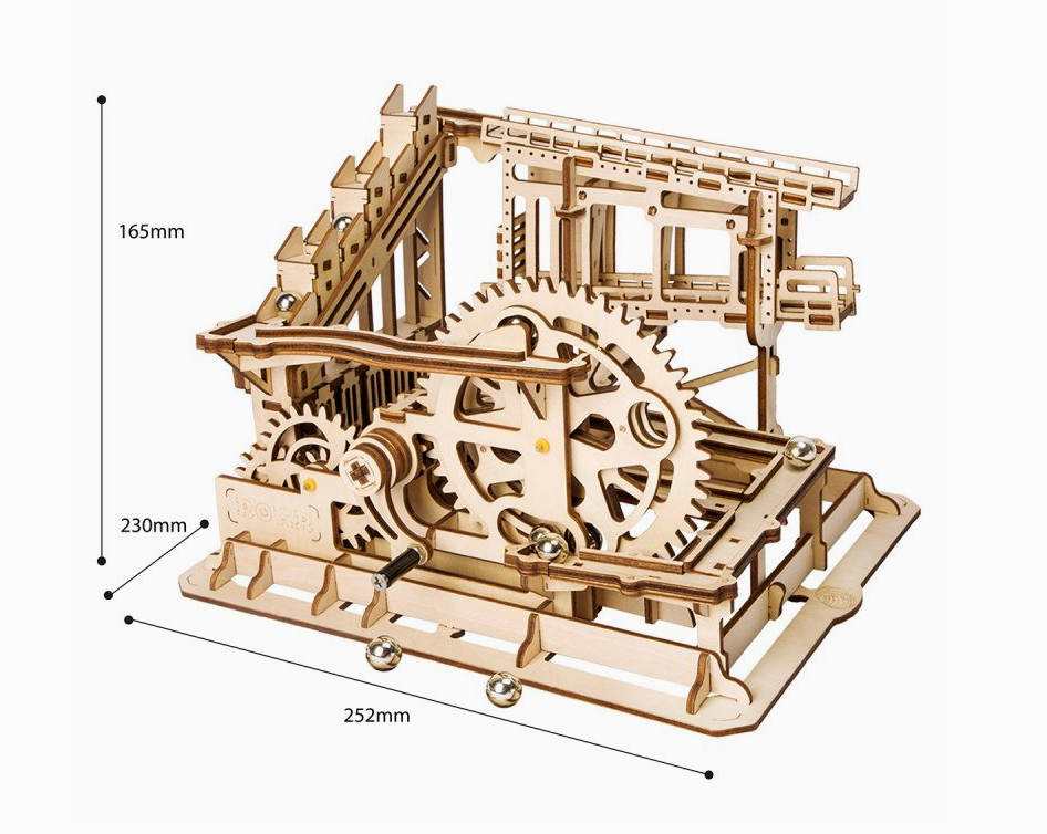 ROKR is a DIY wooden 3D puzzle craft kit featuring mechanical gear system. The kit includes a set of wood sheets with 239 precisely laser cut pieces that assemble together to form the marble maze. Turn the handle to move the gears to lift the marbles up the staircase and down the maze!