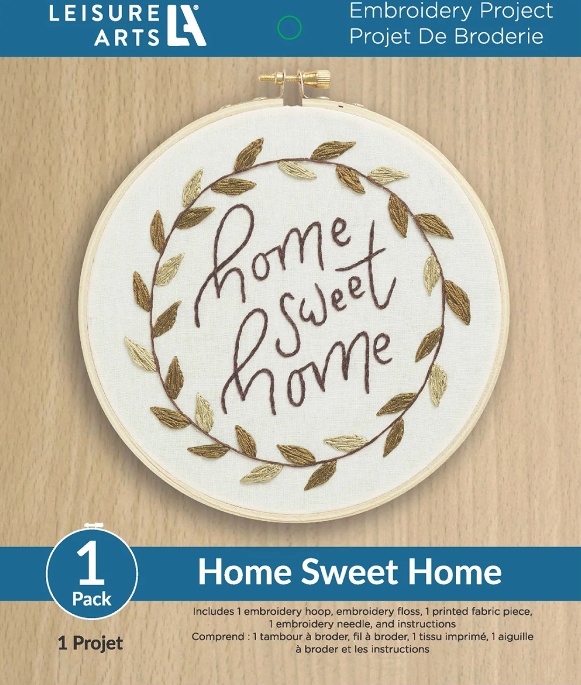 Printed embroidery design features a circular leafy vine wreath with the caption: home sweet home, in the center.