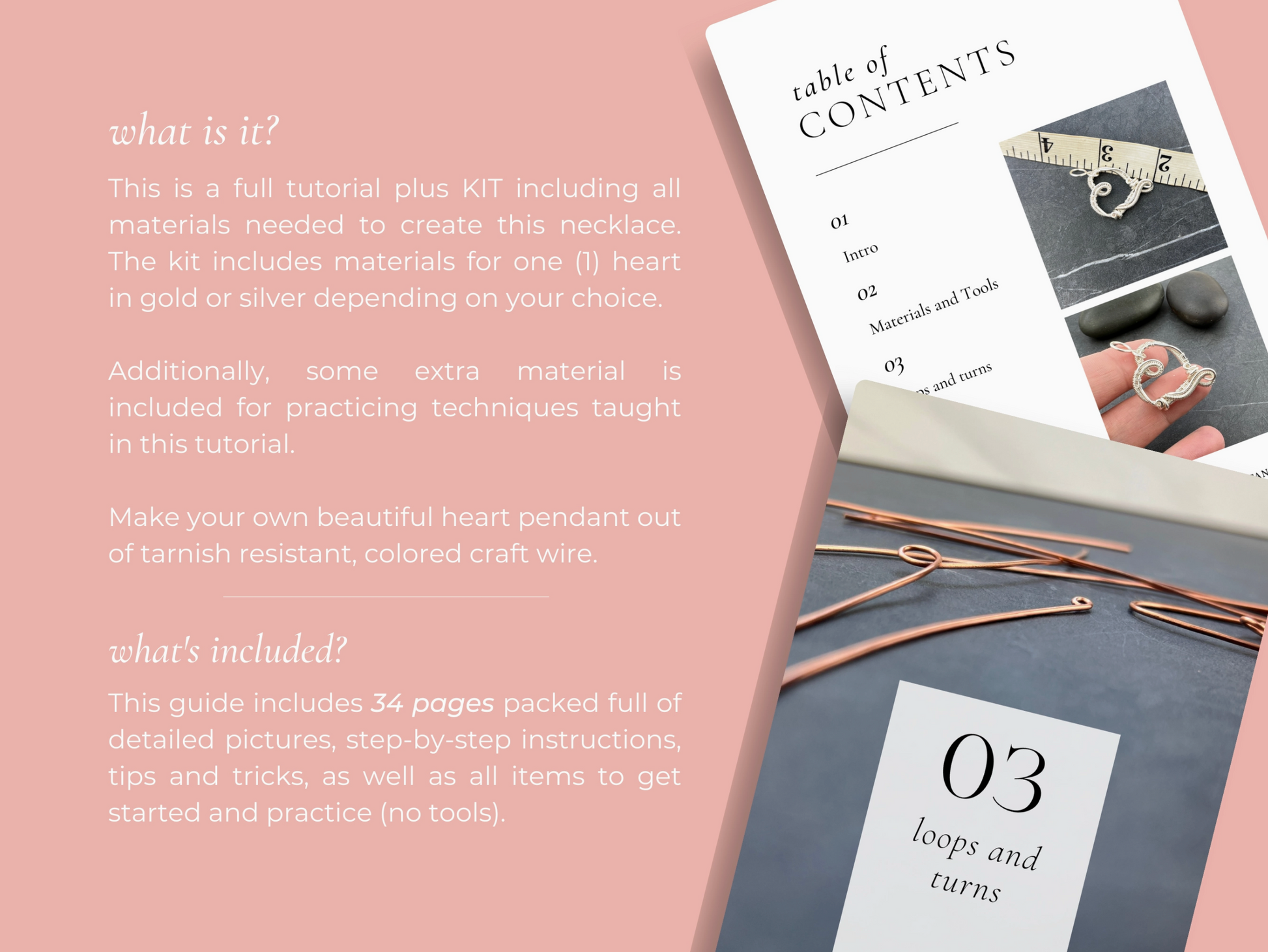 This is a full craft KIT including all materials needed to create a wire woven heart necklace. Additionally, some extra materials are included for practicing the techniques taught in this tutorial. Skills needed: Some wire weaving knowledge