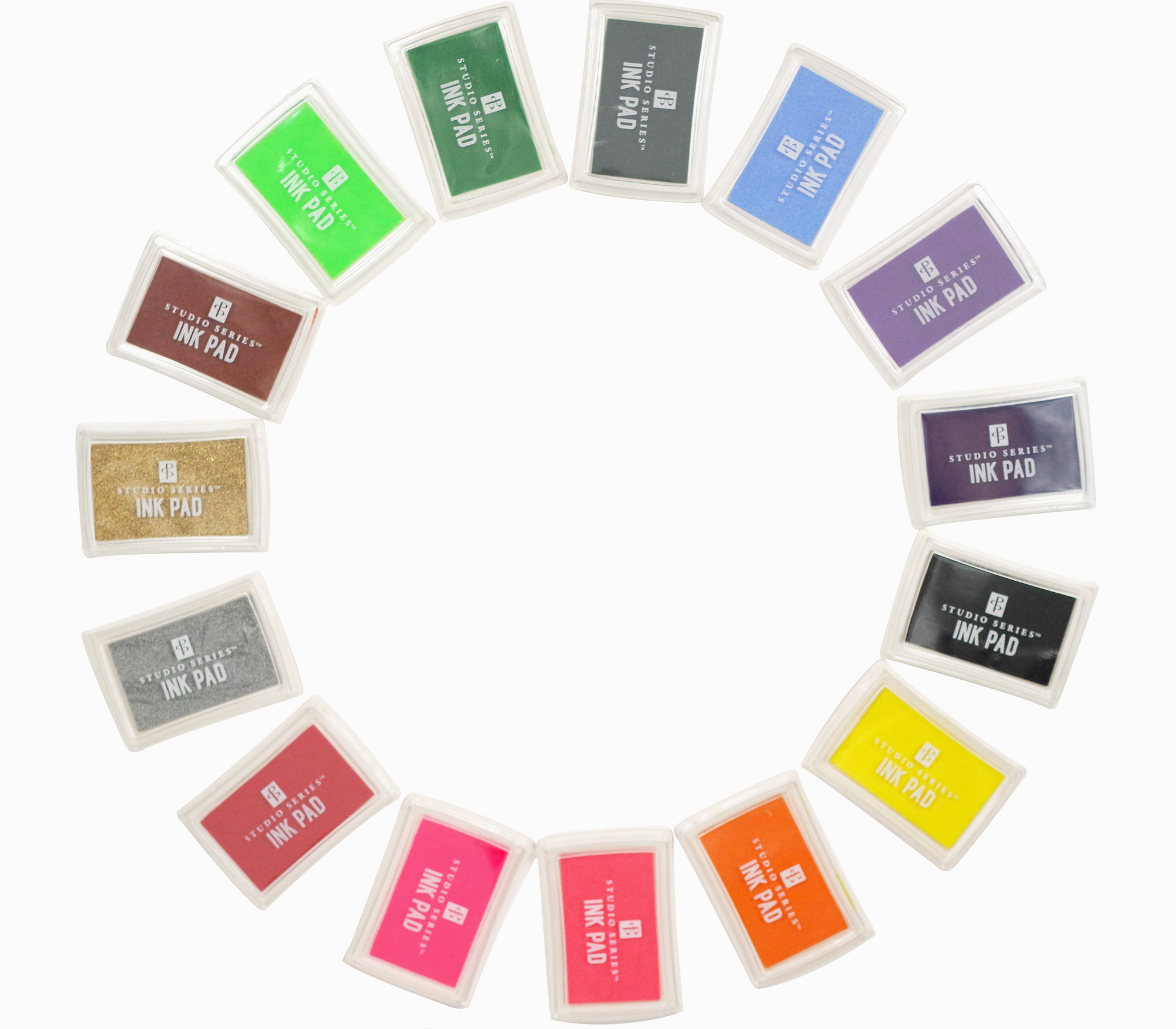 Set of 15 ink stamp pads! 15 different colors! Premium dye ink stamp pads. Perfect for dot journaling, scrapbooking, and crafts of all kinds! Stamp on fabric, paper, or wood. 15 colors: Yellow, Hot Pink, Orange, Salmon, Brick Red, Bright Green, Hunter Green, Celtic Green, Bright Blue, Navy Blue, Purple, Silver, Gold, Brown, and Black. Each stamp pad measures 3'' wide x 2-1/8'' high.