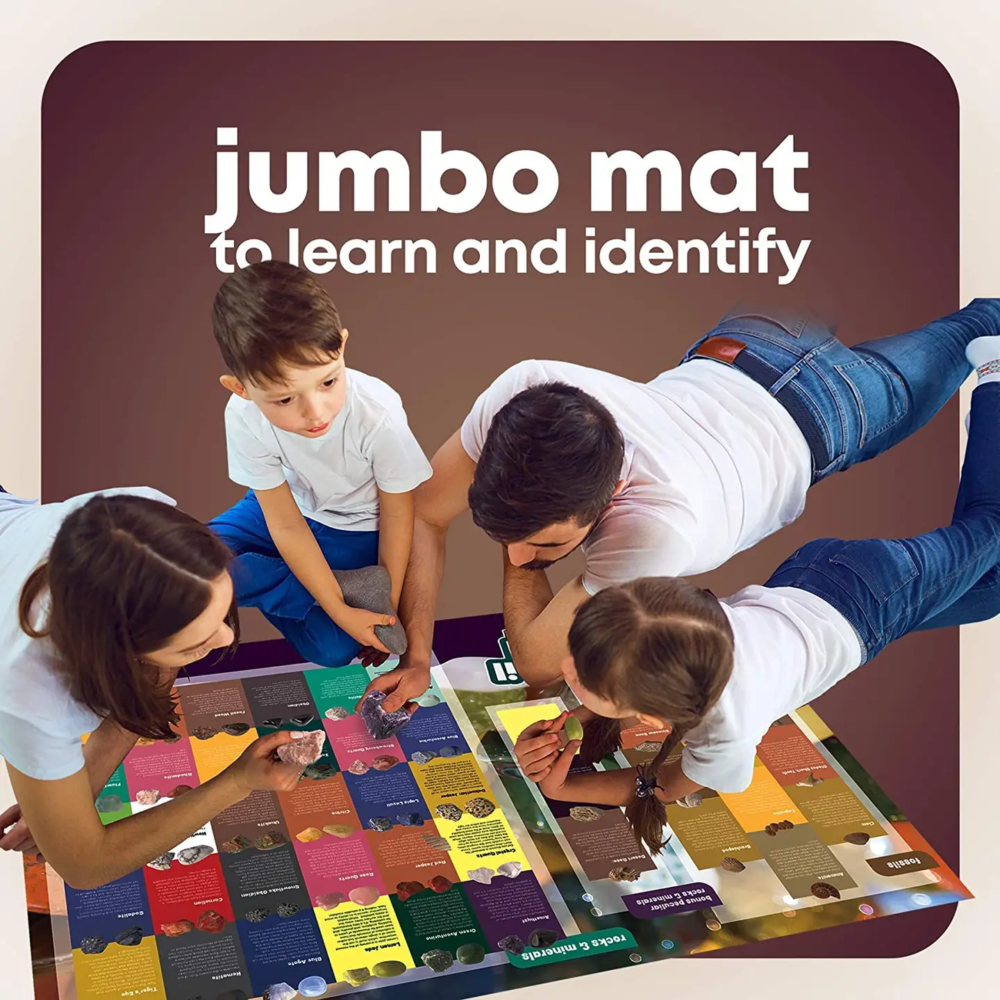 Premium value: Includes select rough rocks and minerals, select polished rocks and minerals, select genuine fossils, an assortment of mixed rocks and minerals, jumbo learning mat, magnifying glass, fossil display case, collector's pouch.