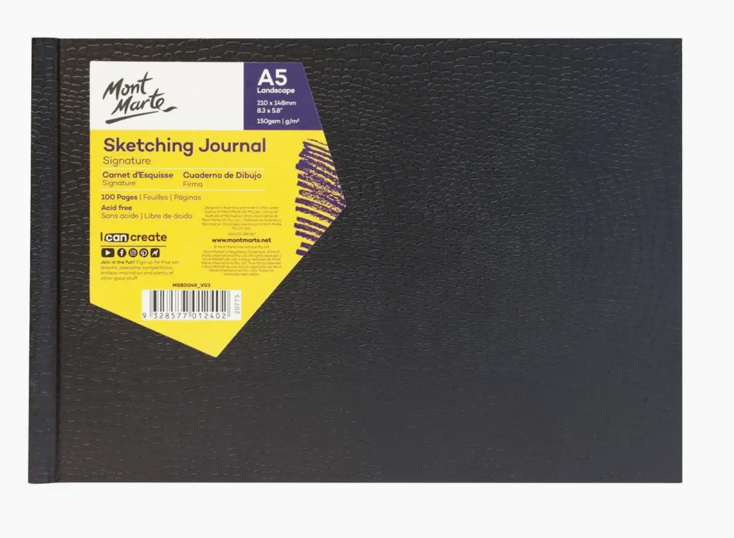 Mont Marte Signature Sketching Journals are an essential for artists of all levels and are available in a variety of shapes and orientations (portrait and landscape). They feature a classic, crocodile look cover and hand bound blank pages in a luxurious Ivory tone. The hardcover protects the pages inside making it the ideal travel journal or for recording your adventures in everyday life. The 150gsm acid free paper features a subtle uniform texture that is suitable for pen, pencil, graphite, charcoal, pastels and light washes.