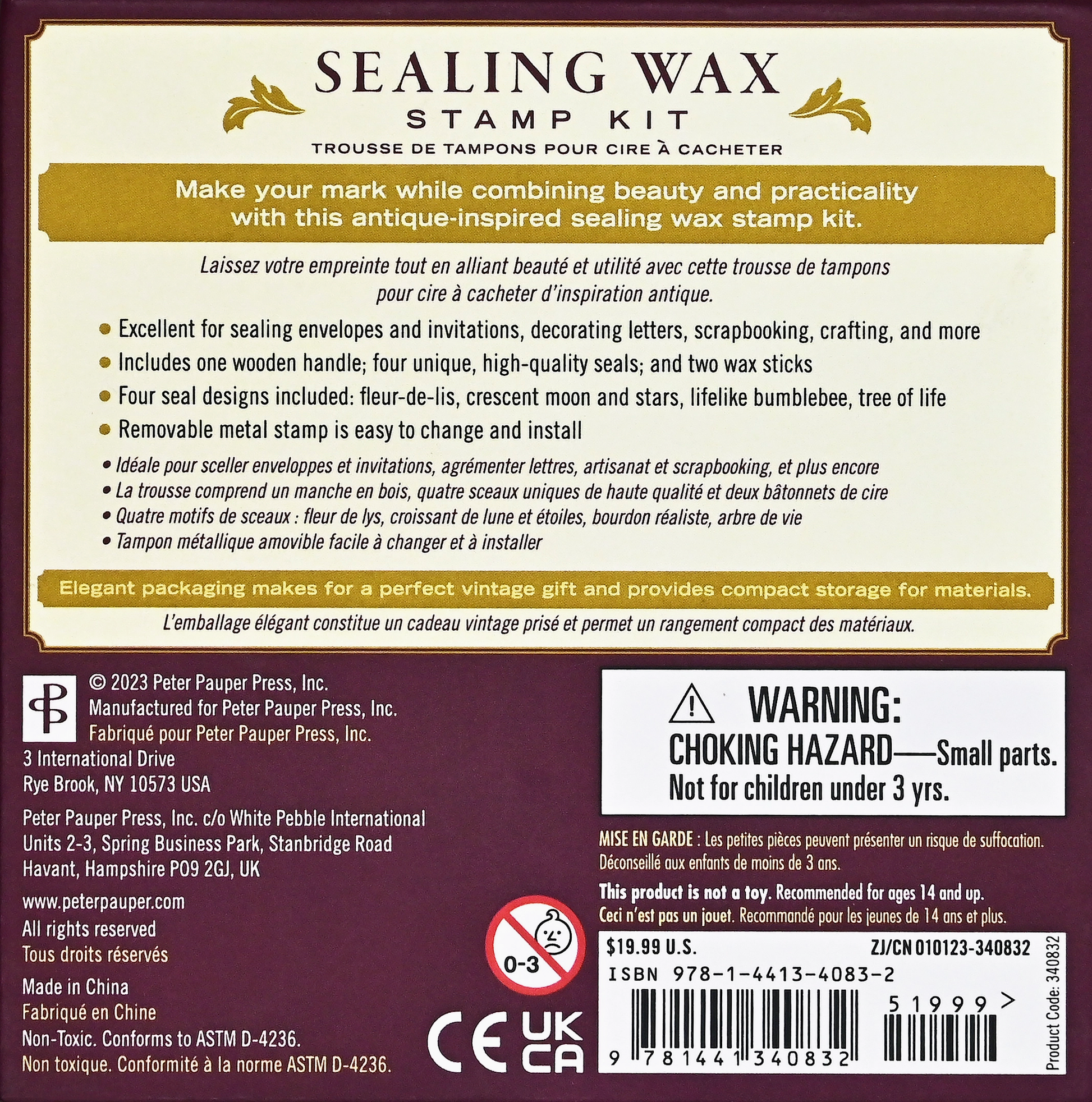 Boxed Sealing Wax Stamp Kit includes 4 unique brass seal stamps, 1 wooden handle, and 2 wax sticks. Seal images depict a fleur-de-lis, a crescent moon and stars, a bumblebee, and a tree of life. Seal stamps attach easily to the wooden handle.