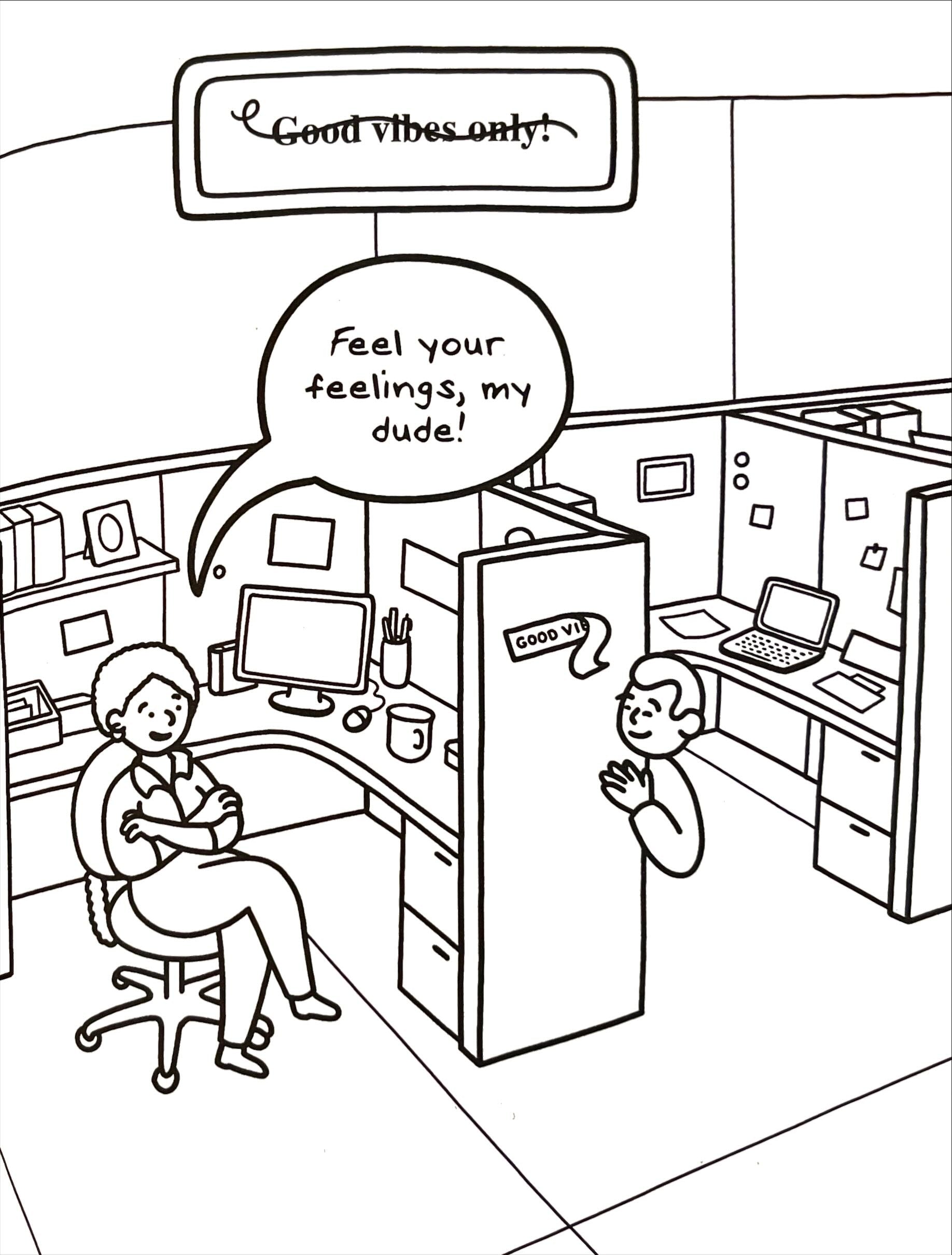 Heteronormative platitudes got you down/ Color these joyful queer affirmations instead1 Next time someone pulls out an old walnut like, "It's just a phase, they'll grow out of it," you can correct it to, "I love your strong sense of self!" Sick of hearing trite shiz like, "It could be worse"? Cross it out with a marker and replace it with, "I'm sorry you're going through this." Not everyone in your life may know how to talk about feelings and affirm your experience, but you can do it for yourself and the community you create. Joe Carlough's thoughtful and humorous revisions of everyday platitudes pair perfectly with Ally Schwed's colorable scenarios of all sorts of queer people bonding with each other, expressing their emotions, and learning to love themselves a little more every day.